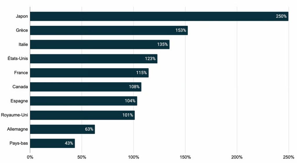 Mais paradoxalement, le niveau de la dette n’est pas un problème à lui seul. Pour s’en convaincre, il suffit de voir qu’un pays comme le Japon a une dette ramenée au PIB bien supérieure.