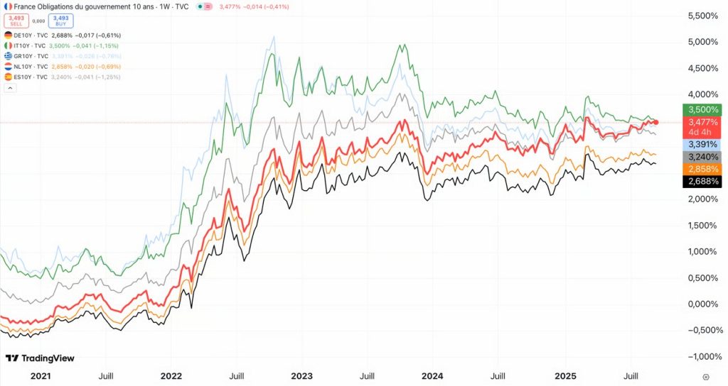 Évolution des taux d’emprunt d’une sélection de pays Européens.